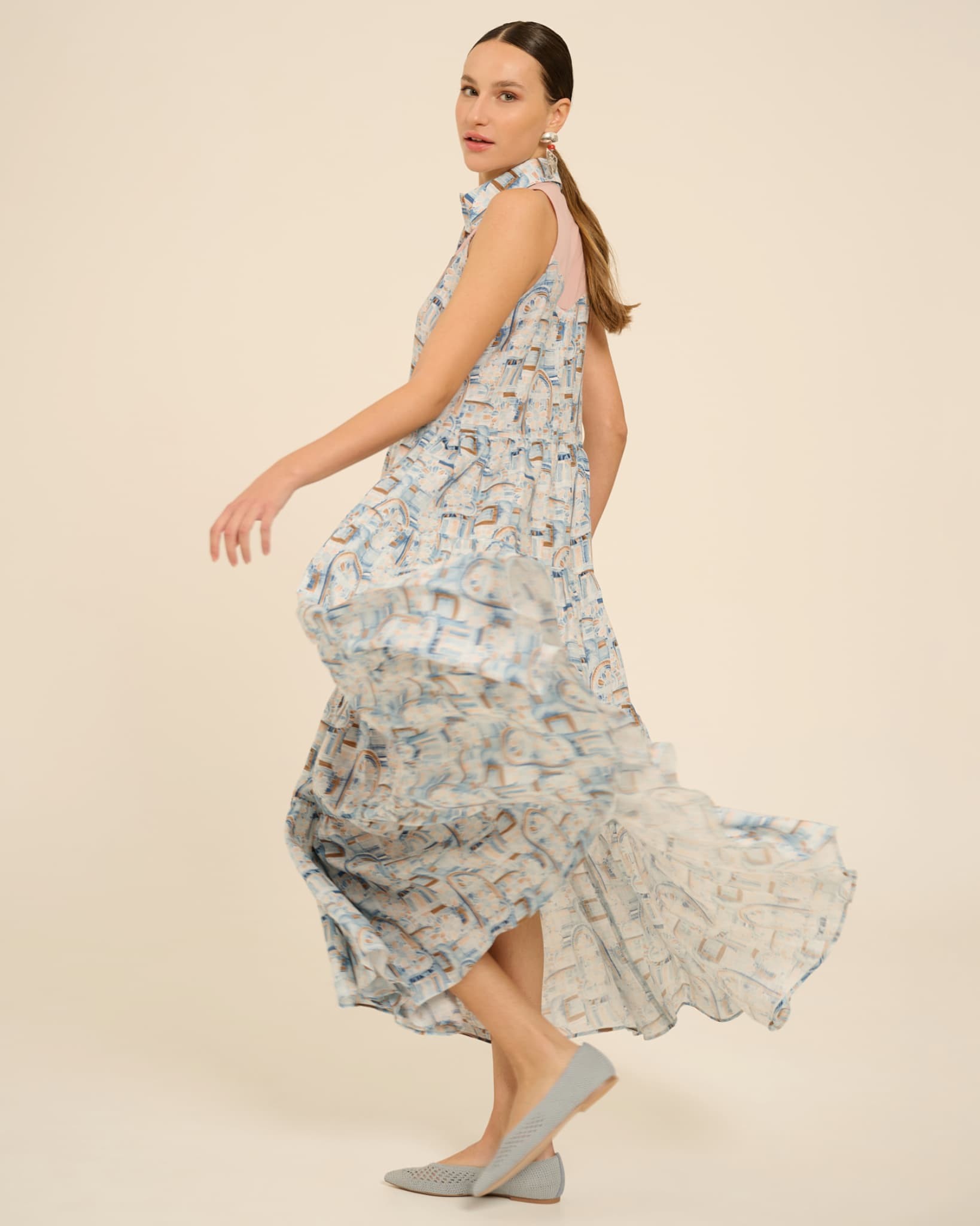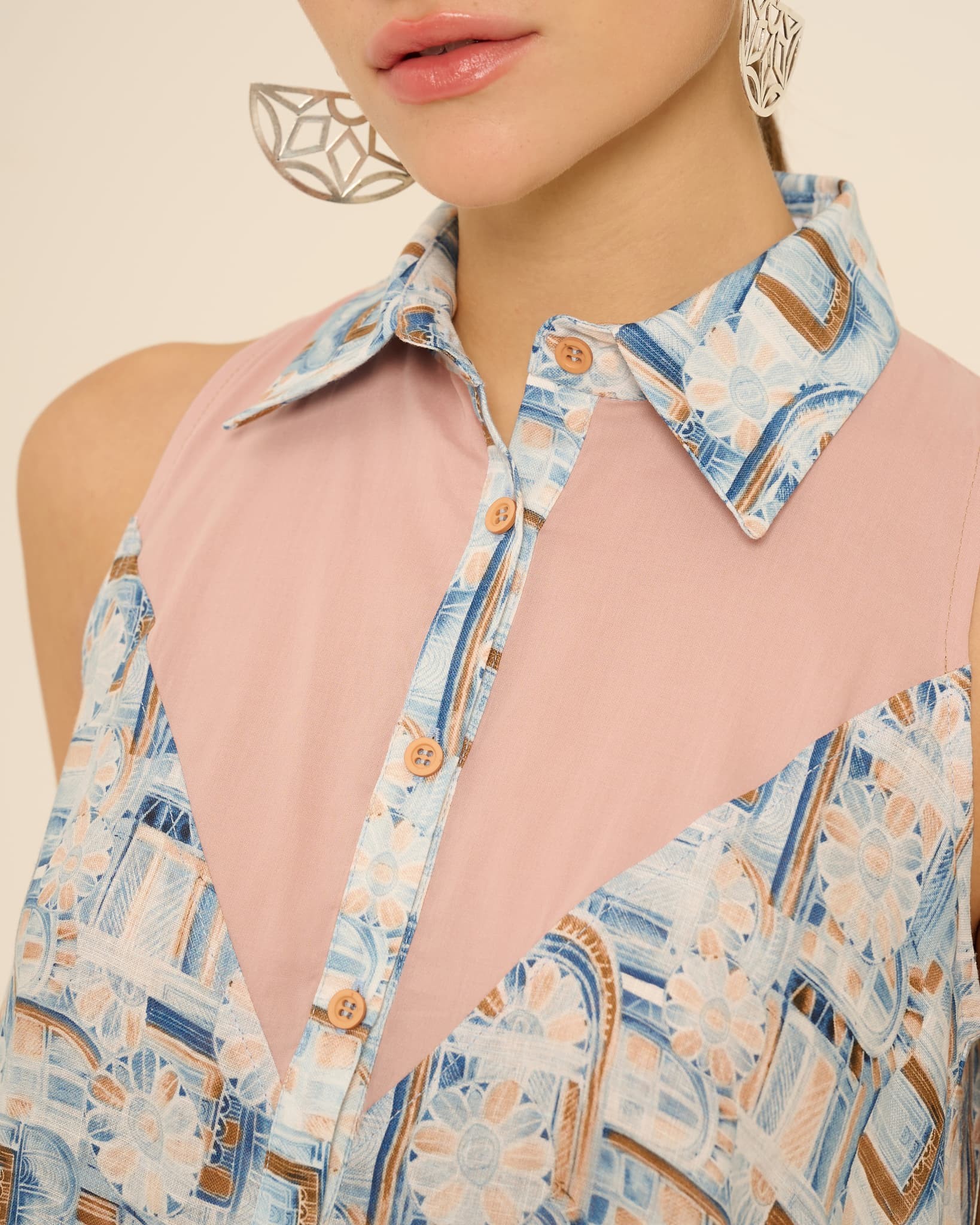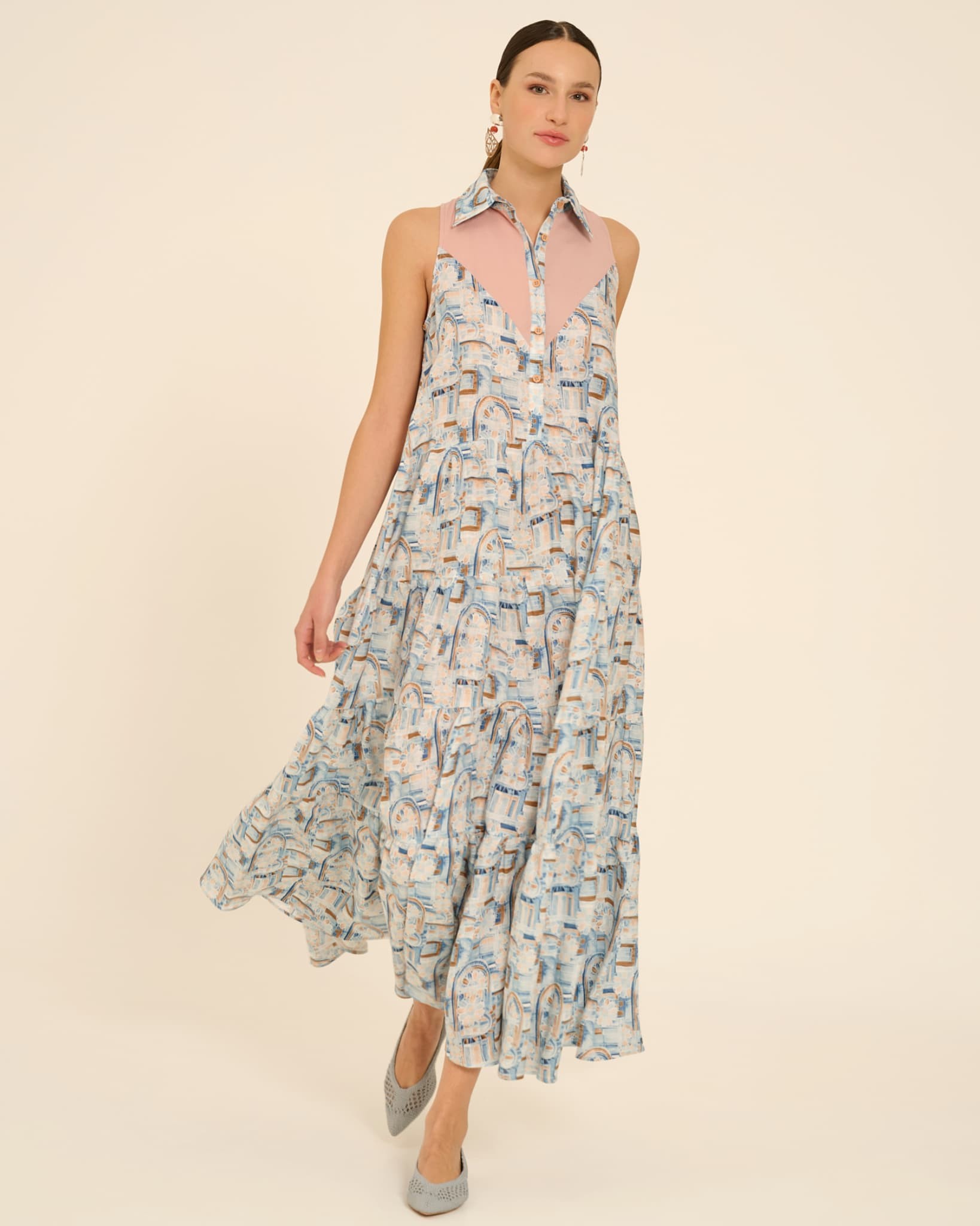 Here's an architectural design that still retains its informality: Tiana is a long shirtdress with gathered ruffles, characterized by ample volume and a flowing allure. Crafted from a clever blend of two different fabrics, it features a pointed collar, thin piping on the front, halterneck shoulders, and a yoke cut that leaves transparency at the upper torso. You can wear it on vacation or in the city, paired with a confident pose and a beautiful pair of oversized mirrored sunglasses.