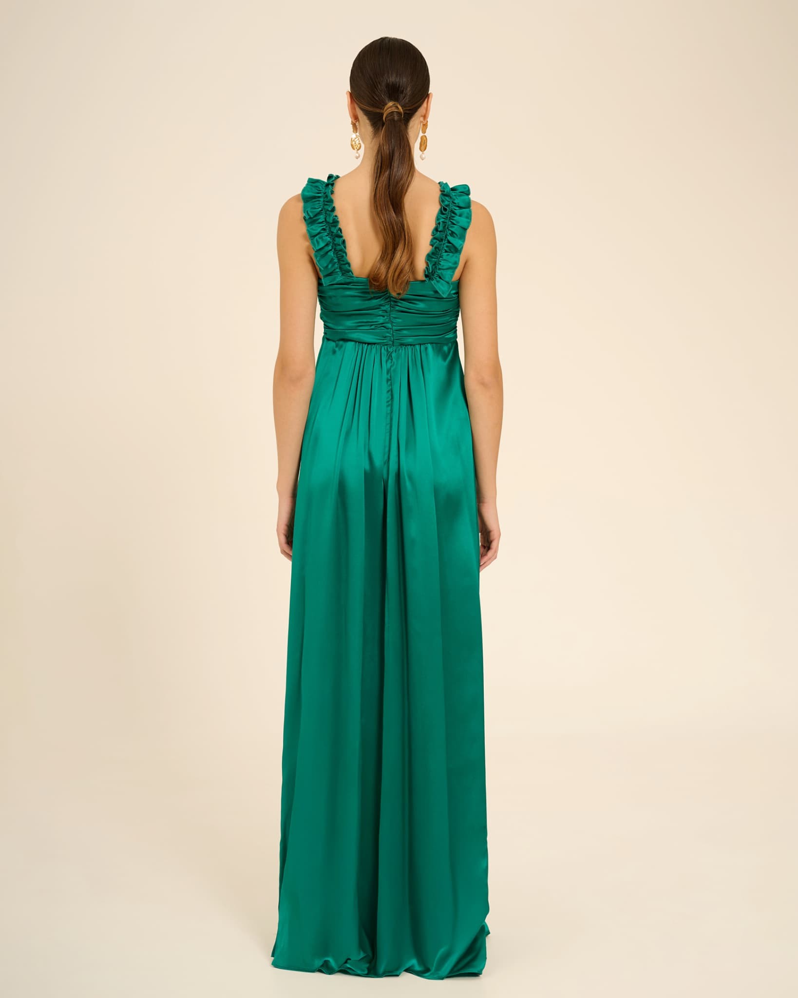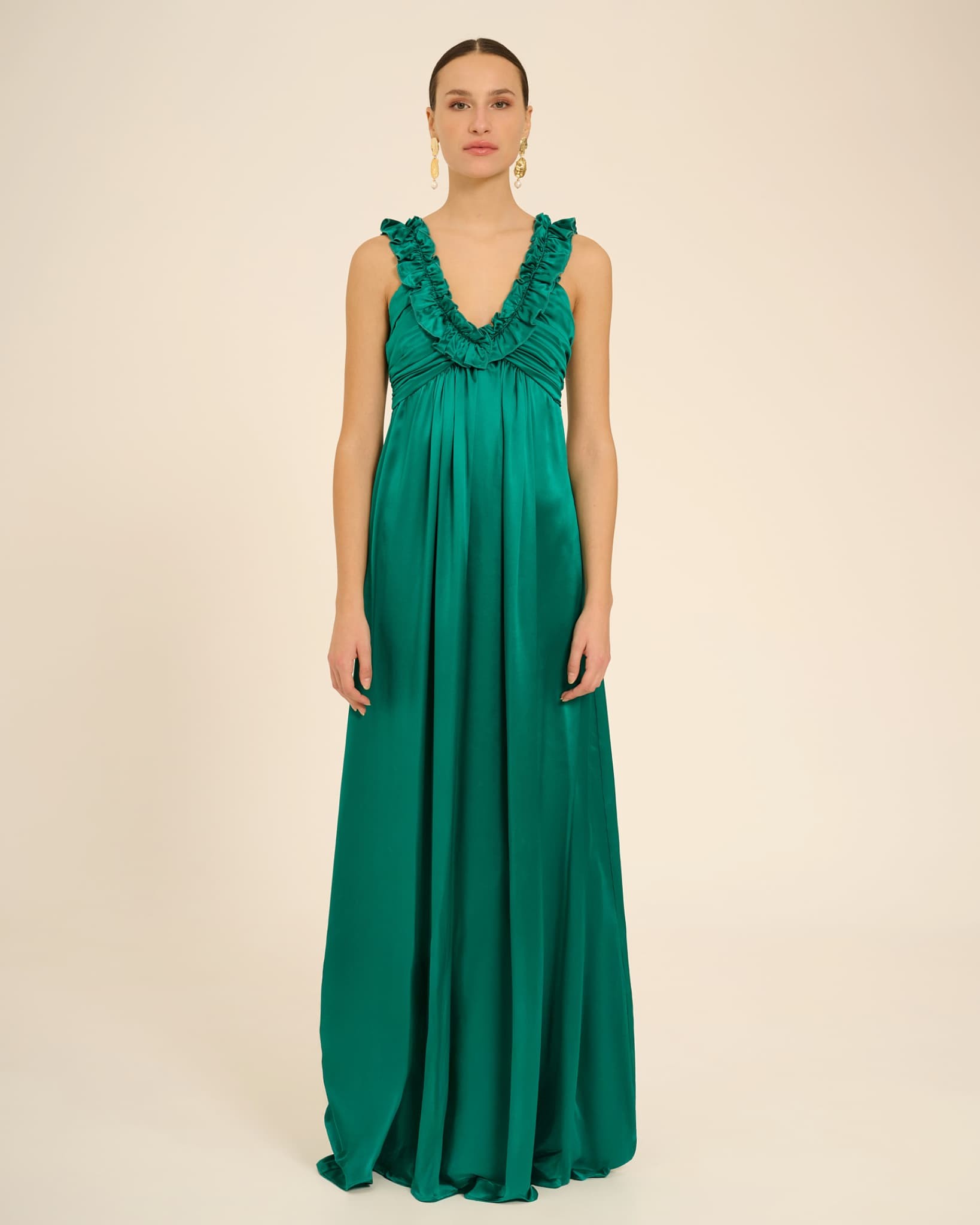 Long, full, and light, Uriel is the perfect dress for your summer poolside ceremony or for a romantic evening by the sea with the breeze caressing your hair and the sand under your feet... The draped bodice fits snugly to the body with the ruffle that runs along the entire V-neckline, enhancing the décolleté, making it a sexy and flirty piece, while the gathered skirt that falls softly on the hips without scrunching up the dress gives it fluidity and volume. The cut below the bust flatters both tall and petite figures.