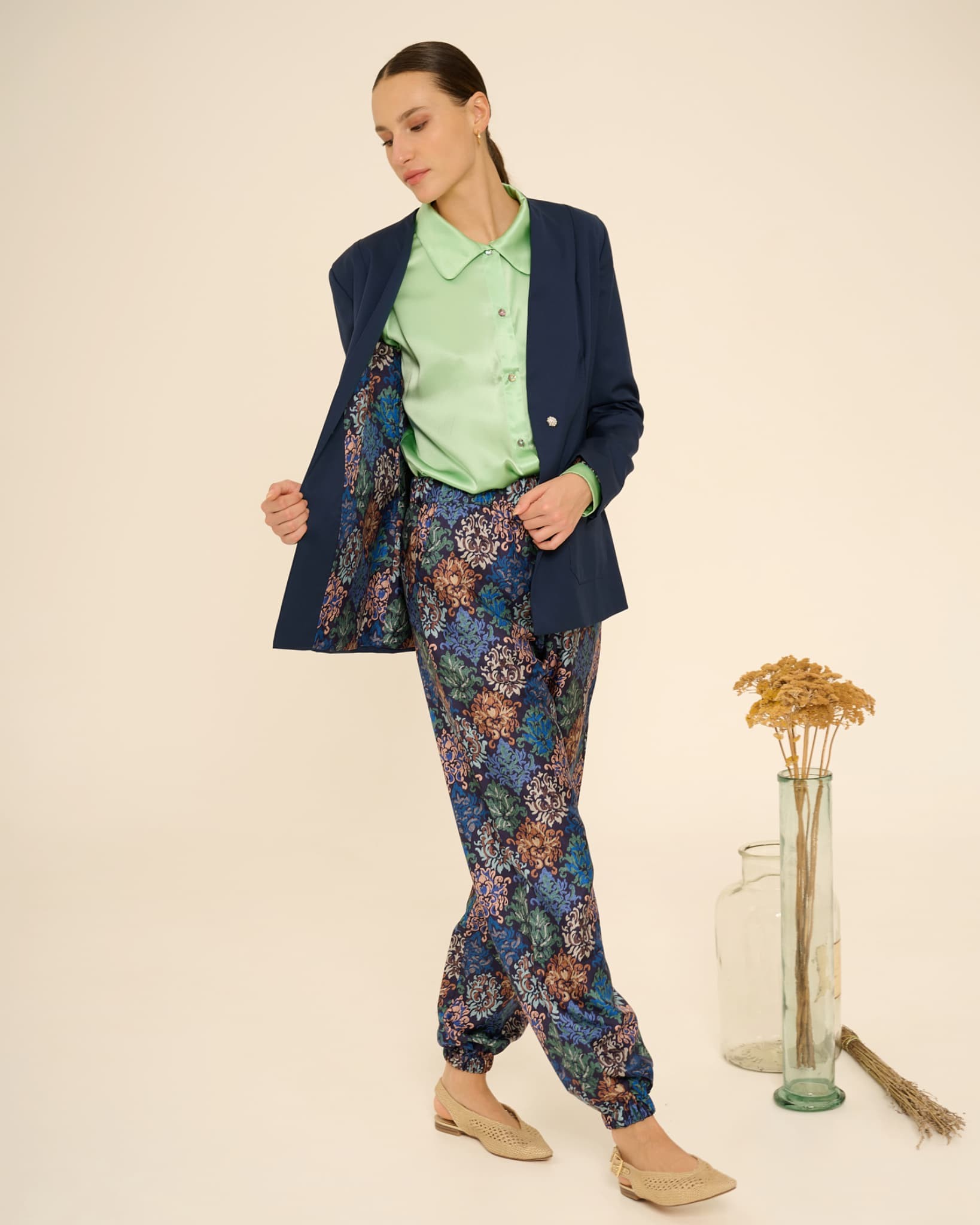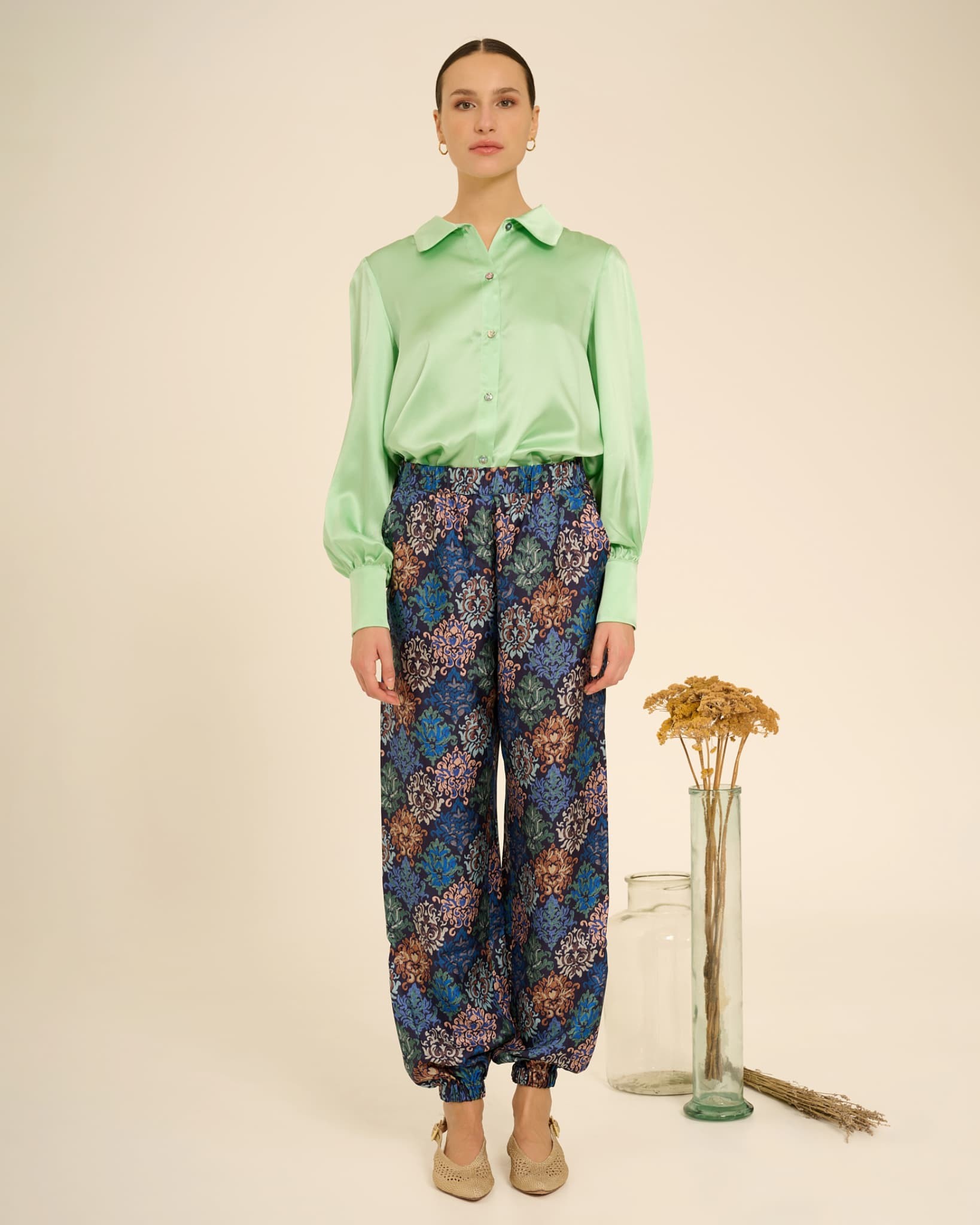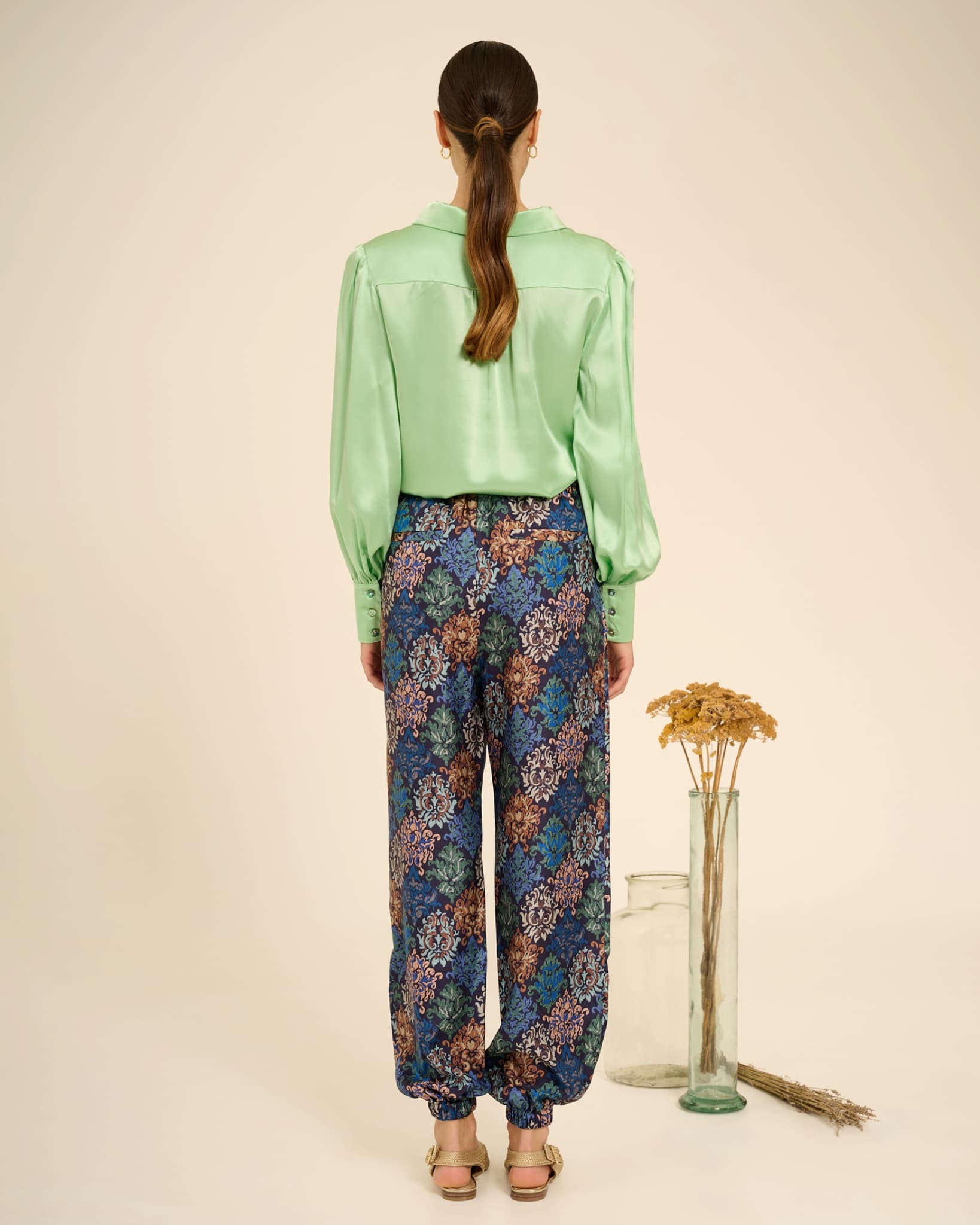 Loris is a pair of comfortable and super versatile cargo pants. Featuring an elastic waist and ankle, it features a French pocket—a tailored detail—two welts on the back, a slightly dropped crotch, and a flowing silhouette. This printed version is truly chic and can be paired with any top, whether elegant or casual, plain or patterned. It's a true must-have for your spring/summer!