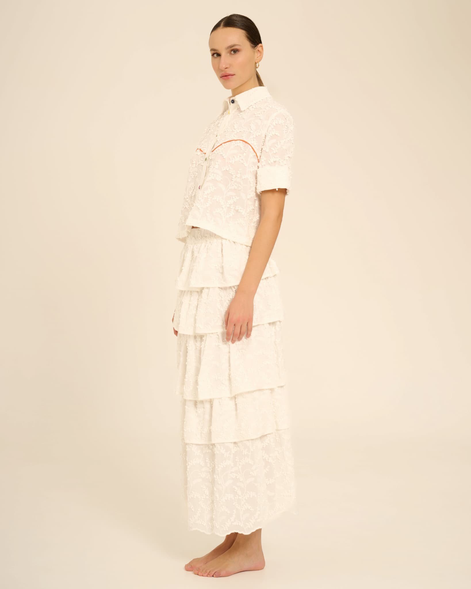 ⁃ Hems finished with bias binding except for the last flounce which is scalloped