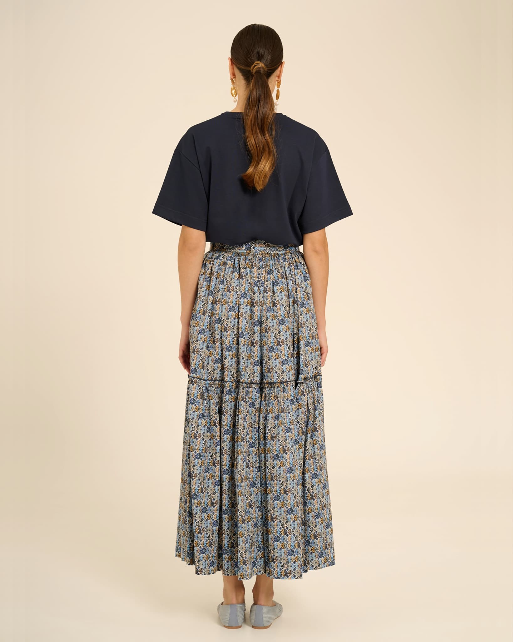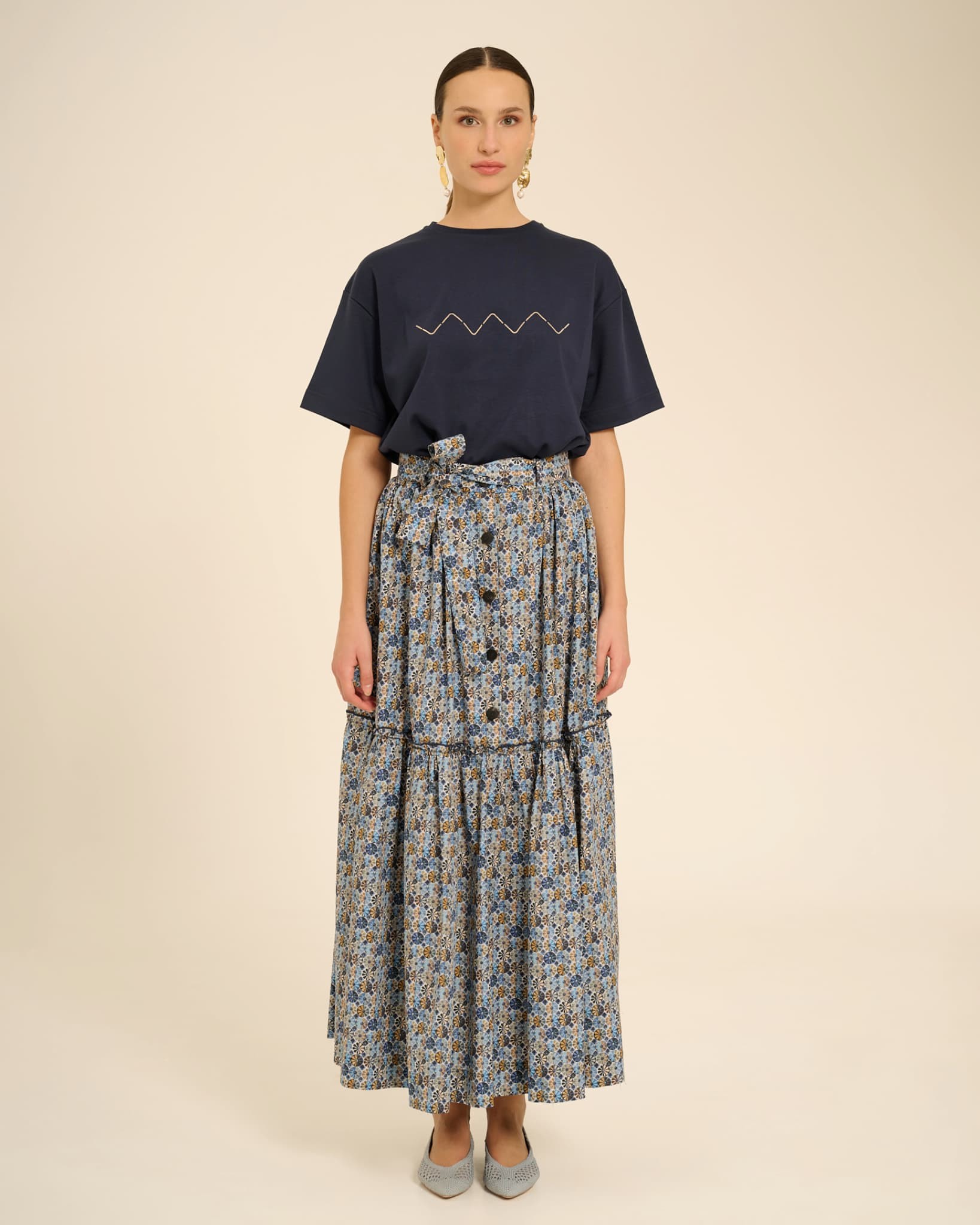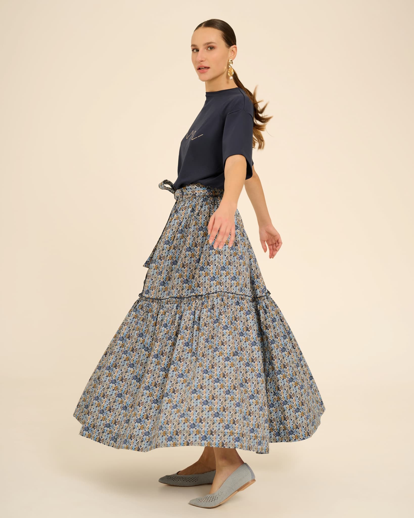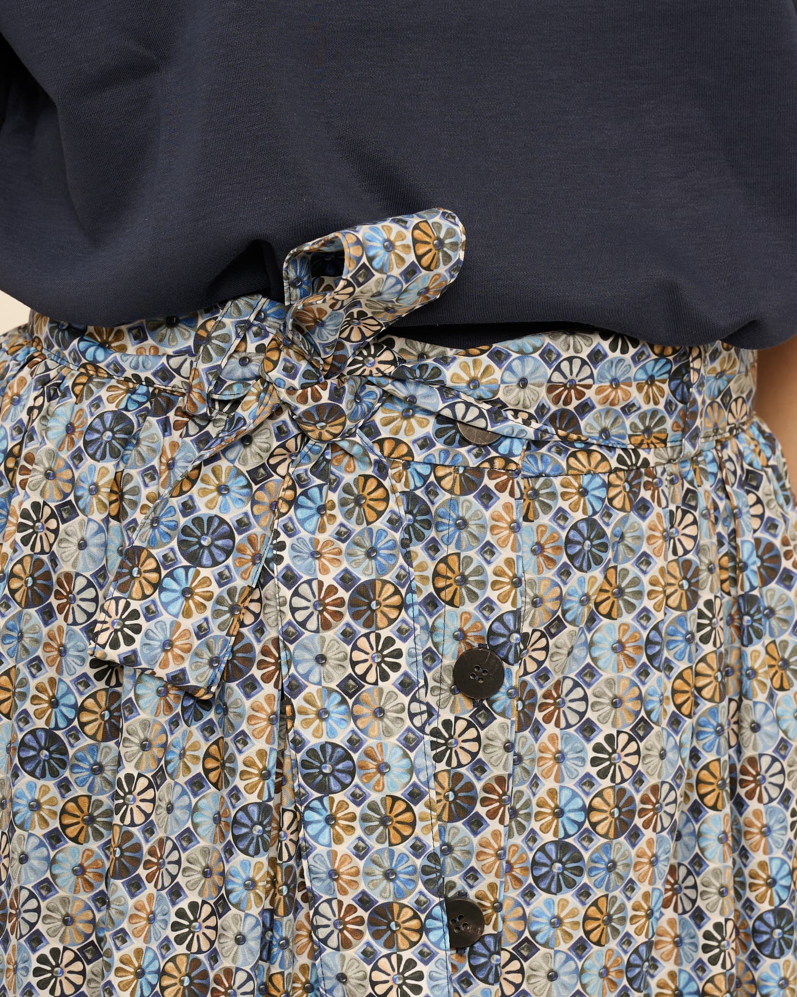 Here's a gorgeous style to show off during your outings: Manuela will capture attention with its ample volume and sophisticated details! It features a strap overlaid with a fabric belt to tie at the waist, a button-up front, and a double gathered ruffle. Pair it with a plain t-shirt for a fresh and informal look or with a tailored blouse for a chic effect suitable for both day and evening.