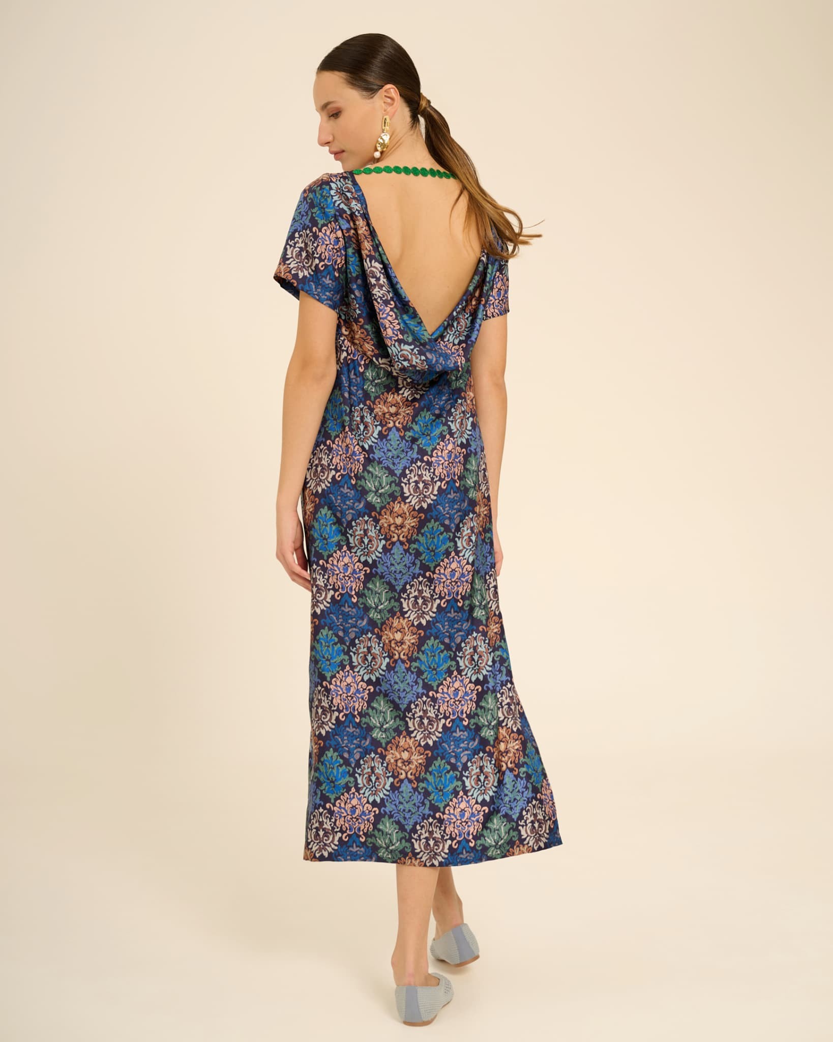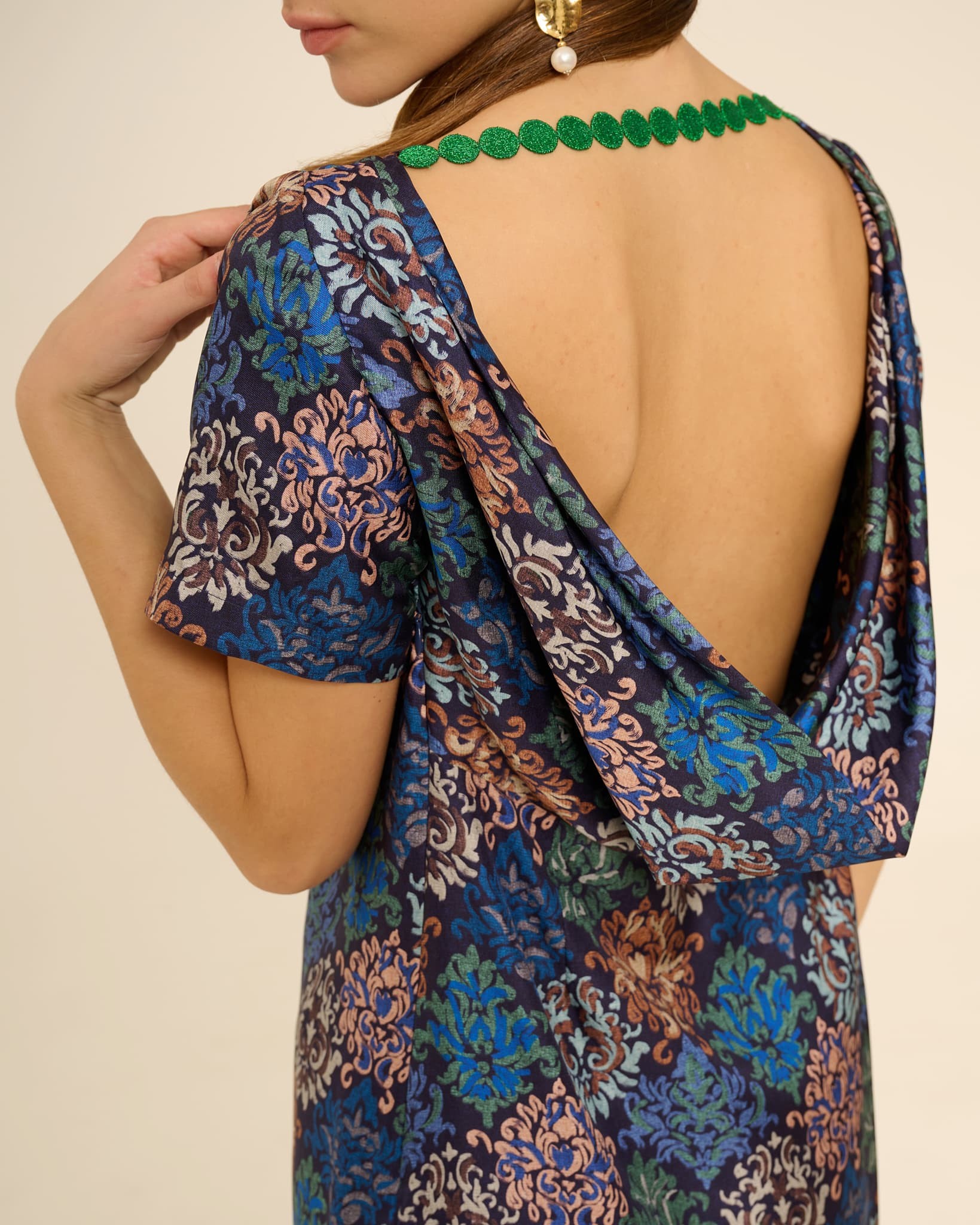Scollo a barchetta, linea leggermente sagomata e manica corta, Ambra ad un primo sguardo è classico ed elegante. L’effetto sorpresa lo abbiamo sul retro, grazie al morbido scollo a cappuccio drappeggiato, che scopre la schiena e dona un tocco sexy e glamour al capo. Indossalo sia di giorno che di sera cambiando le calzature e i gioielli: la stampa gli conferisce infatti un carattere versatile e non troppo serioso. Perfetto anche per la cerimonia. Da notare il bordo ricamato che tiene unite le spalle sul dietro, un dettaglio su cui sicuramente cadrà l’occhio se porti i capelli corti o un’acconciatura raccolta!